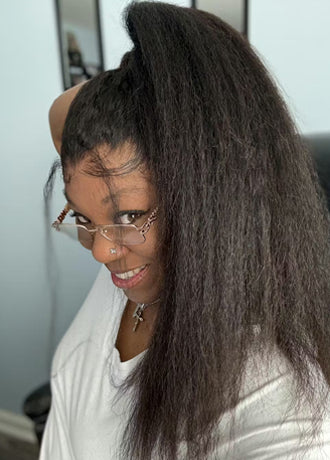 OQ HAIR Kinky Straight Invisi-Drawstring Flexible Fit 360 Lace Front Glueless Wig With Bleached Knots