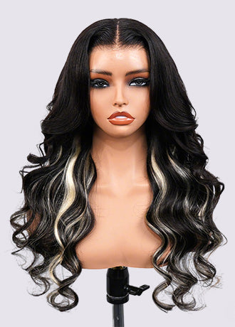 OQ HAIR Black Blonde Skunk Stripe Layered Body Wave Glueless Wig With Face-Framing Curtain Bangs Pre-Cut 13x6 Lace Adjustable Drawstring Wear Go Wig